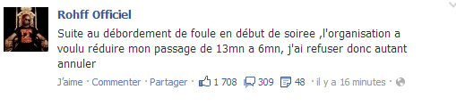 Via un message posté sur sa page Facebook , Rohff a annoncé avoir annulé sa participation à Urban Peace. Il déclare « Suite au débordement de foule en début de soirée ,l’organisation a voulu réduire mon passage de 13mn a 6mn, j’ai refuser donc autant annuler »