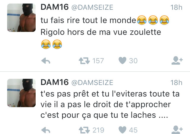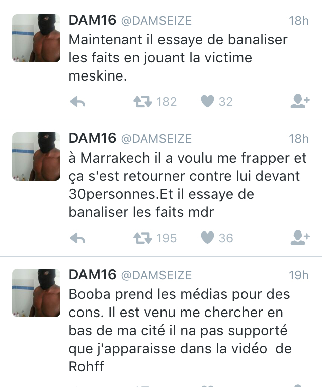 Des déclarations qui ne sont pas tombées dans l’oreille d’un sourd. Plutôt discret sur les réseaux sociaux, Dam16 a publié quelques tweets à ce sujet lundi en début de soirée. D’après lui, Booba prendrait « les médias pour des cons ». « Maintenant il essaye de banaliser les faits en jouant la victime meskine » ajoute Dam16 qui fait référence à leur rixe.