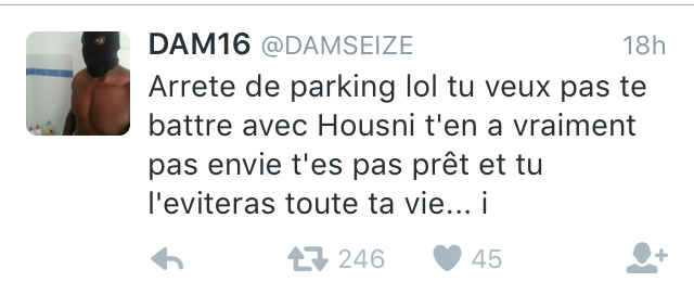 Il réagit également aux propos de Booba sur la volonté que n’aurait pas Rohff de le chercher. Pour Dam16 c’est l’inverse : « Arrete de parking lol tu veux pas te battre avec Housni t’en a vraiment pas envie t’es pas prêt et tu l’eviteras toute ta vie ». Il rappelle également que suite à l’affaire de la boutique Unküt, Rohff ne pourrait pas approcher physiquement Booba sous peine d’encourir des sanctions judiciaires.