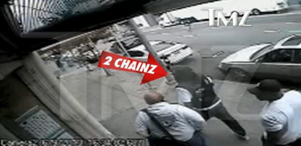 Bien mal lui en a pris. Aujourd’hui le site TMZ publie la vidéo du braquage de 2 Chainz. On y voit le rappeur et son crew se faire braquer par deux hommes : l’un en veste noir et l’autre en tshirt blanc. L’entourage du MC et ce dernier tente de prendre la fuite tant bien que mal. Peine perdue, le rappeur trébuche laissant tout le loisir à son agresseur de se servir. D’ après les forces de l’ordre il aurait été délesté de son portefeuille et de son téléphone portable.