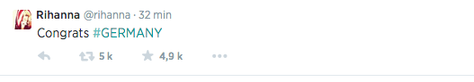 Sûrement dans un soucis d’équité, la star internationale n’oublie pas de féliciter l’équipe allemande pour sa qualification via un second tweet, «Congrats #GERMANY» écrit-elle.