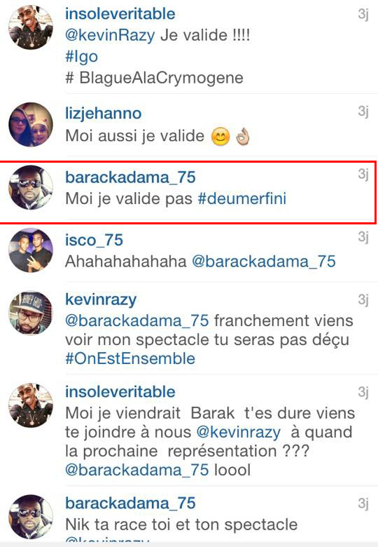 L’Insolent proche de Barack Adama rajoute également un commentaire «Moi je viendrait Barak t’es dure viens te joindre à nous @kevinrazy à quand la prochaine représentation ???@barackadama_75 loool» . Rien n’y fait Barack Adama répond sèchement à Kevin Razy «Nik ta race toi et ton spectacle». Les internautes surpris par les déclarations violentes de Barack Adama s’interrogent, celui ci donnera plus tard un début d’explication sous le même cliché. Il écrit : «Les humoristes sont prêt a tout pour percer comme lui la!! Il sait très bien pourquoi je dit ça! Je valide pas du tout» sans donner plus de précisions.