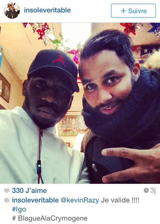 Il y a quelques jours sur Instagram, Barack Adama l’un des leaders de la Sexion d’Assaut s’en est vertement pris à l’humoriste Kevin Razy. A l’origine, une photo postée par L’Insolent de l’institut sur son compte avec Kevin Razy. L’Insolent écrit : «@kevinRazy Je valide !!!! #Igo #BlagueAlaCrymogene» . Barack Adama commente «Moi je valide pas #deumerfini» . Ce à quoi répond l’humoriste en signe d’apaisement «franchement viens voir mon spectacle tu seras pas déçu #OnEstEnsemble».