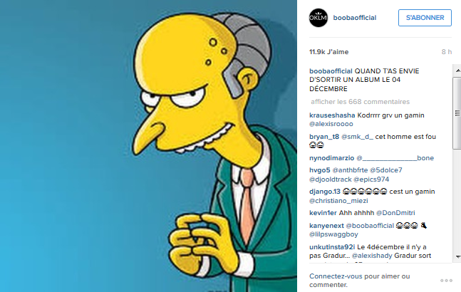 Il y a quelques heures, Kopp toujours taquin s’est exprimé sur son compte Instagram. Il a posté une photo de Mr Burns (ndlr : Personnage du dessin animé « Les Simpson » qui est sans scrupules) qui a un air machiavélique, avec la légende suivante : « QUAND T’AS ENVIE D’SORTIR UN ALBUM LE 04 DÉCEMBRE »Booba prend un malin plaisir à lancer des piques à Rohff, son rival de toujours. Reste à savoir si ce dernier répondra par la suite.