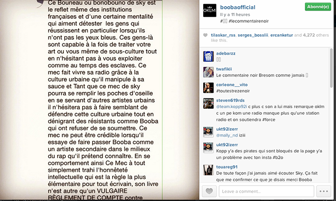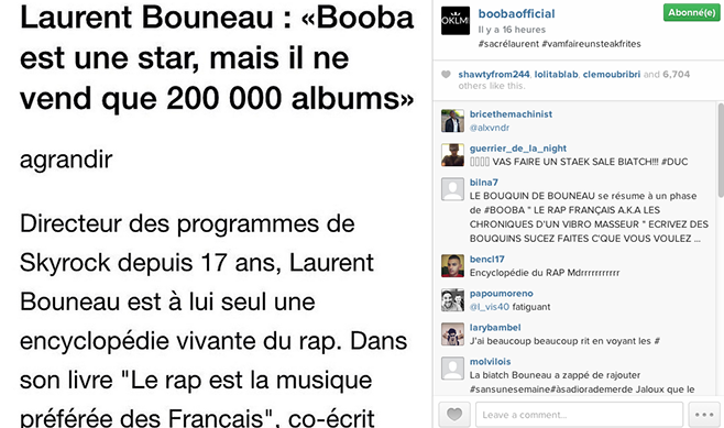 Le rappeur commente cette déclaration par un laconique «#sacrélaurent #vamfaireunsteakfrites». Quelques heures plus tard, Booba poste un commentaire d’un anonyme au sujet de Laurent Bouneau dans lequel il est notamment dit que celui ci «manipule à sa sauce» la culture urbaine et qu’il «déteste les gens qui réussissent en particulier quand ils n’ont pas les yeux bleus». Un commentaire qui reflète surement la pensée du rappeur de Boulogne qui accompagne son post d’un hastag «#lecommentairenoir». Ainsi les relations entre Booba et la radio qui s’étaient quelques peu apaisées ces dernières années apparaissent comme glacières au plus au point. Du moins, du côté de Booba. Laurent Bouneau qui ne veut pas «être pris dans une pièce de théâtre» confie au Parisien qu’il continuera à programmer le rappeur «en fonction du public».