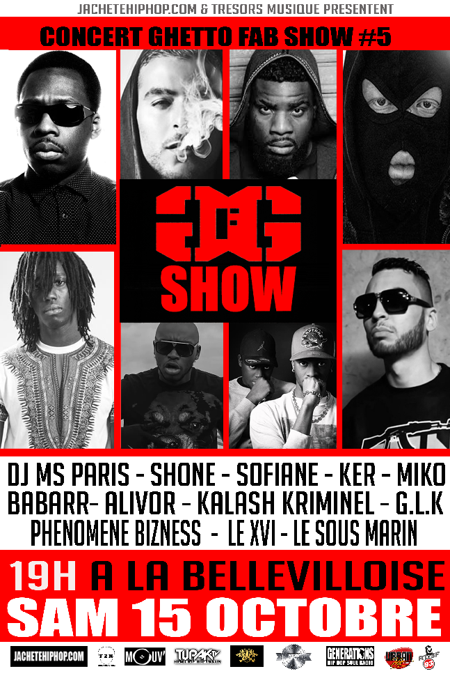 Le 15 octobre prochain se déroulera la cinquième édition du Ghetto Fab Show à La Bellevilloise. Pour cette nouvelle édition, l’un des collectifs les plus emblématique du rap français n’a pas fait les choses à moitié. Trois heures de show avec une multitude d’artistes phares ou déjà en place. A partir de 19 heures, vous pourrez retrouvez Sofiane, Kalash Criminel, Shone, Miko, Ker, Babarr, Alivor, Phénomene Bizness,GLK et Le Sous Marin. Vous pouvez dès à présent réserver votre billet via ce lien : http://bit.ly/2cZiq0z. Soyez au rendez-vous !