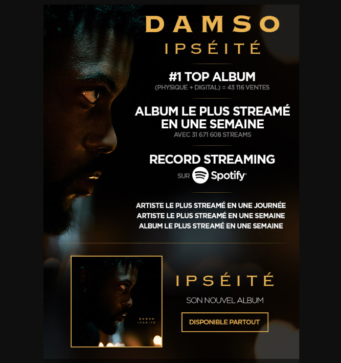 L’album IPSÉITÉ de Damso est disponible depuis le 28 avril dernier dans les bacs et sur toutes les plateformes de streaming. Pour promouvoir son nouvel opus, le rappeur de Bruxelles s’est appuyé sur quelques inédits hors album et deux clips J’respecte R & Nwaar Is The New Black. Aujourd’hui, les chiffres de ventes de son nouveau projet sont tombés. L’artiste a écoulé 43 116 exemplaires tous formats confondus de son album (ndlr : 6983 en digital, 6229 en physique et 29 904 copies vendues en streaming). Malgré le fait que son projet a fuité quatre jours avant sa sortie, Damso Dams’ a réalisé un très bon démarrage commercial. Il s’est placé en tête du top album physique et digital et a battu de nombreux records sur Spotify en étant l’artiste le plus streamé en une semaine et en une journée. Le MC se place d’un point de vue commercial en tête d’affiche et peut préparer sereinement sa tournée à venir.