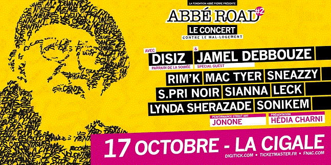 Un concert aura lieux samedi 17 octobre prochain à partir de 19h00 à La Cigalle. Pour l’occasion plusieurs artistes Hip Hop monteront sur scène. Vous y retrouvez entre autres, DisizRim’K, Mac Tyer, Sneazzy, S.Pri Noir, Sianna et L.E.C.K. Tous les artistes présents sur scène feront leur prestation à titre gratuit pour soutenir l’action de la fondation contre le mal-logement. Disiz sera le parrain de cette soirée, Hedia Charnit en sera l’animatrice. Jamel Debouze sera également présent en tant que spécial guest.