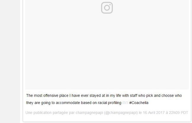 Au festival de Coachella, les visiteurs voient de grandes stars défiler sur scène comme Drake, qui était présent pour assurer le show à Indio, en Californie. Ce dernier a séjourné dans un hôtel cinq étoiles, dont les services lui ont déplu.