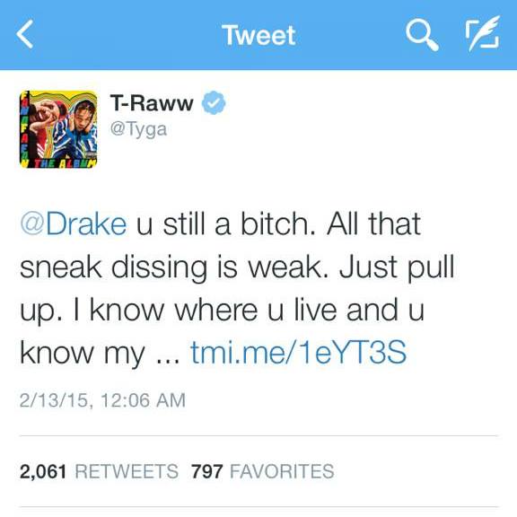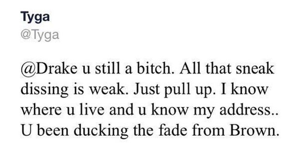 Une référence à peine voilée à Kylie Jenner, la petite amie mineure de Tyga qui est également la petite soeur de Kim Kardashian. Visiblement touché par ces attaques, la réponse cinglante de Tyga ne s’est pas faite attendre. Sur Twitter le rappeur a écrit avant de supprimer son tweet : «Tu restes une pu**. Ton clash sans dire mon non est pitoyable. Je sais où tu habites, tu sais où j’habites. Tu as fuis la rixe avec Brown (ndlr: Chris Brown)» . Une invitation claire à en venir aux mains ou autre pour régler leur différent. Celui-ci perdure depuis que l’acolyte de Chris Brown avait déclare dans Vibe que Drake été «fake».