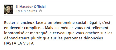 Face à la polémique suscitée par son dernier morceau Les beurettes aiment , le rappeur El Matador a réagi il y a quelques heures via un court message posté sur son mur Facebook . Le rappeur marseillais déclare « Rester silencieux face a un phénomène social négatif, c’est en devenir complice… Mais les médias vous ont tellement lobotomisé et matraqué le cerveau que vous crachez sur les dénonciateurs plutôt que sur les personnes dénoncées HASTA LA VISTA ».