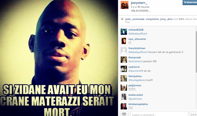 Il y a quelques heures de cela, Joey a posté sur Instagram une photo du jeune rappeur du 93 Fababy sur laquelle est écrit « Si Zidane avait mon crâne, Materazzi serait mort ». Il ajoute sa touche en commentaire : « #BLACKSERIE…. »