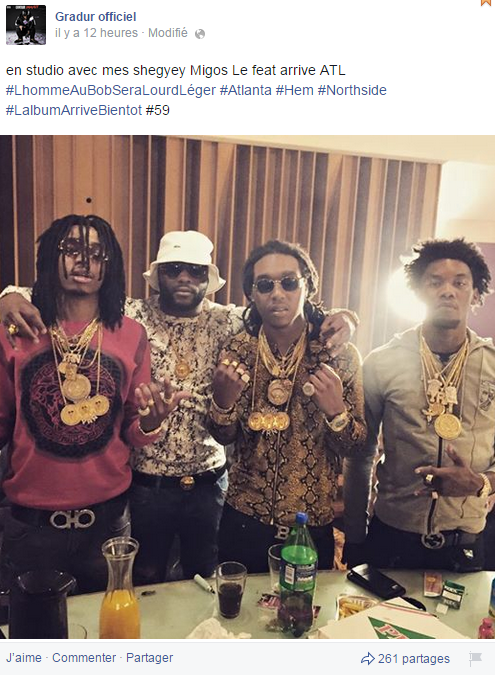 Il s’agit du groupe originaire d’Altanta Migos. Gradur l’a fait savoir via son compte Facebook il y a quelques heures. Il écrit :