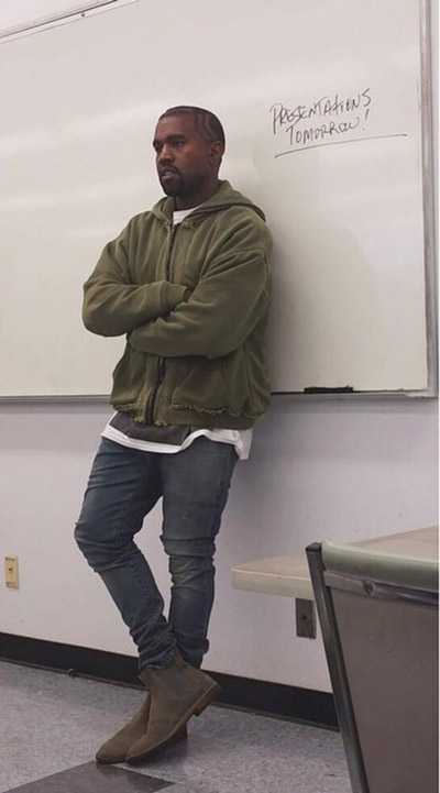 Ses TIG, Yeezy les effectue d’une manière assez sympathique puisqu’il enseigne ou plutôt donne sa vision de la mode à des étudiants du Trade Technical College, à Los Angeles.
