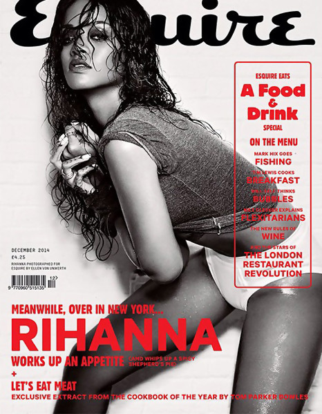 Hier on vous dévoilait quelques clichés de sa séance photo topless pour ELLE US, Rihanna a également posé topless pour Esquire mais cette fois-ci dans un registre beaucoup plus provocant. Dans son numéro de décembre (comme ELLE), Esquire a interviewé Rih à l’occasion de la sortie prochaine de son album. Évoquant des choses diverses et variées, elle nous donne même sa recette pour le punch. Mais revenons-en à la fameuse séance photo tout en provocation. Un des cliché prend place dans une salle de bain dans laquelle Riri en culotte uniquement, prend le jet d’eau et s’arrose le slip (ou plutôt dedans). Dans les autres, elle se déshabille de plus en plus, toujours topless.