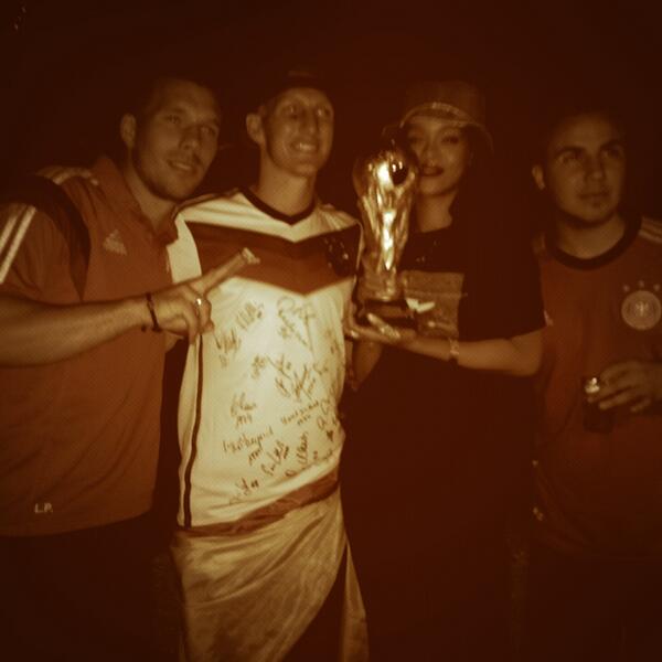 Dimanche soir, au Maracana de Rio, après la victoire de l’équipe Allemande contre l’équipe d’Argentine en finale de la Coupe du Monde Rihanna a posté quelques clichés de l’after du match.