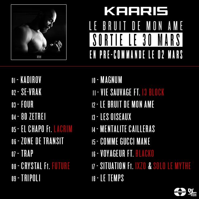 Après avoir dévoilé la cover et la date de sortie de son album LE BRUIT DE MON AME il y a deux jours, Kaaris vient de dévoiler les featurings de celui-ci. On y retrouve le rappeur du 94 Lacrim (ndlr: sur le titre El Chapo), l’américain Future (ndlr: sur le titre Crystal) mais aussi Blacko (ndlr: sur le titre Voyageur ) qui vient de faire retour dans la scène urbaine française avec brio.