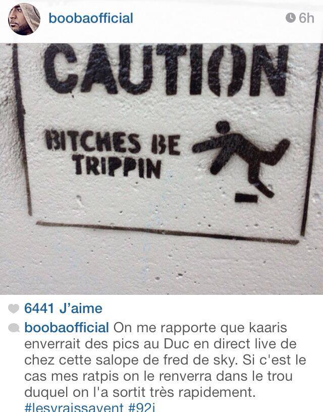 Invité de l’émission planète Rap sur Skyrock , Kaaris est revenu mardi soir sur le message incisif qu’a posté Booba sur Instagram la nuit dernière . Pour rappel , Booba déclarait  » On me rapporte que kaaris enverrait des pics au Duc en direct live de chez cette salope de fred de sky. Si c’est le cas mes ratpis on le renverra dans le trou duquel on l’a sortit très rapidement. #lesvraissavent#92i »