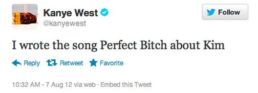 Kanye West a déclaré hier sur son compte Twitter que son morceau « Perfect B*tch » lui avait été inspiré par sa compagne Kim Kardashian.