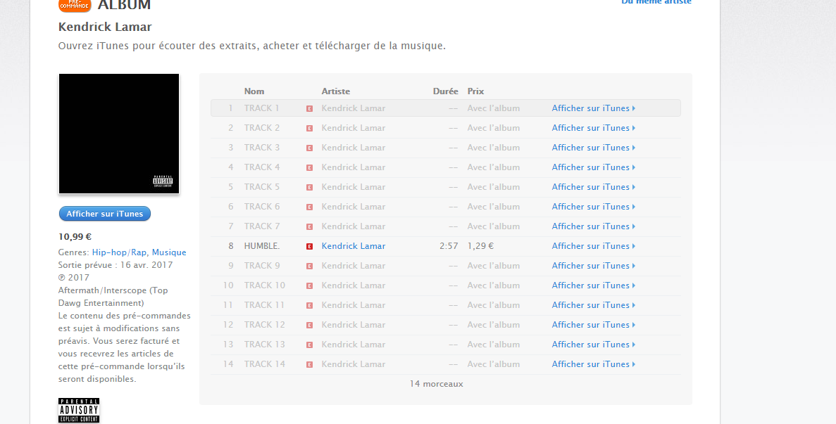 L’album composé de 14 titres est actuellement en précommande sur le site iTunes. On ne connaît pas encore le titre ni le visuel de la pochette de l’album. Le nom des tracks ne sont également pas précisés mis à part le titre « Humble ».