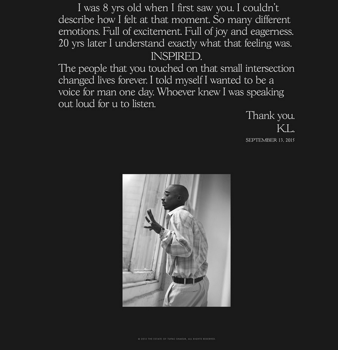 Dimanche dernier, outre-atlantique se déroulait un anniversaire mémorable. Le 13 septembre 1996, Tupac mourait assassiné à Las Vegas. A cette occasion, Kendrick Lamar a voulu rendre hommage à son mentor. Le jeune prodige a rédigé une lettre pour cet artiste qu’il admirait tant. Il écrit : « J’avais 8 ans la première fois que je t’ai vu. Je ne pourrais pas décrire ce que j’ai ressenti à ce moment-là. Tellement d’émotions différentes. Plein d’enthousiasme. Plein de joie et d’excitation. 20 ans plus tard, je comprends exactement quel était ce ressenti. J’étais inspiré. Les gens que tu as touchés ont vu leur vie changer pour toujours. Je me suis dit que je voulais être aussi un guide pour les hommes, un jour. N’importe qui savait que je parlais tout haut pour que tu m’entendes.Merci ».