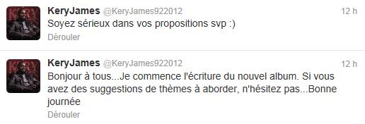 Kery James est actuellement en pleine préparation de son nouvel album. Proche de ses fans, il les invite via son compte Twitter à proposer des thèmes qu’ils aimeraient voir apparaître.