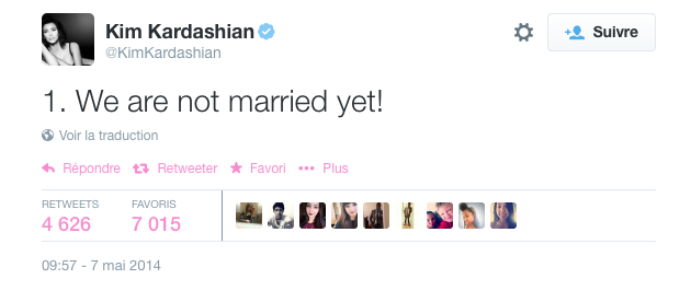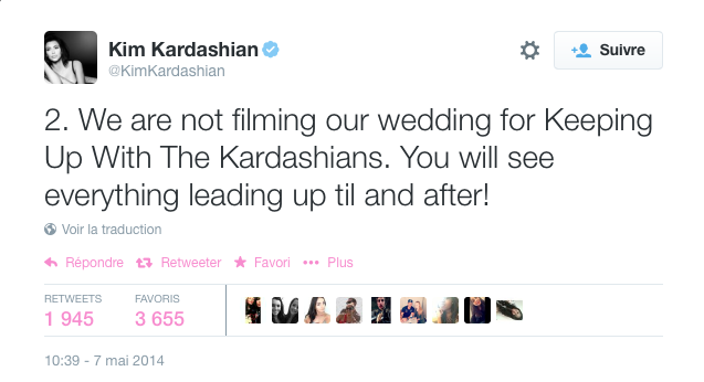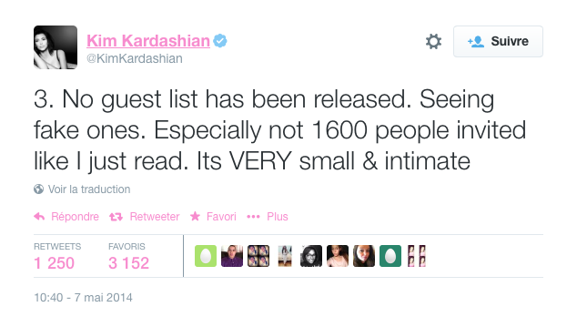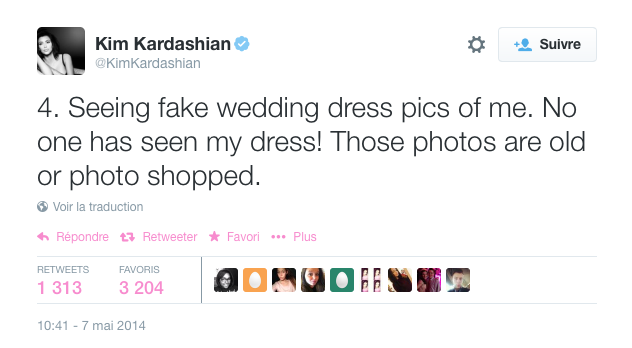 Le 07 mai, Kim Kardashian a posté plusieurs tweets démentant toutes les rumeurs de guest list, de robe de mariée ou encore de retransmission dans son émission Keepin Up with The Kardashians.