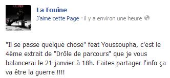 La Fouine vient d’annoncer la publication de son titre « Il se passe quelque chose », en featuring avec Youssoupha, le 21 janvier prochain à 18 heures ! Pour rappel, « Drôle de parcours » sera dans les bacs le 4 février.