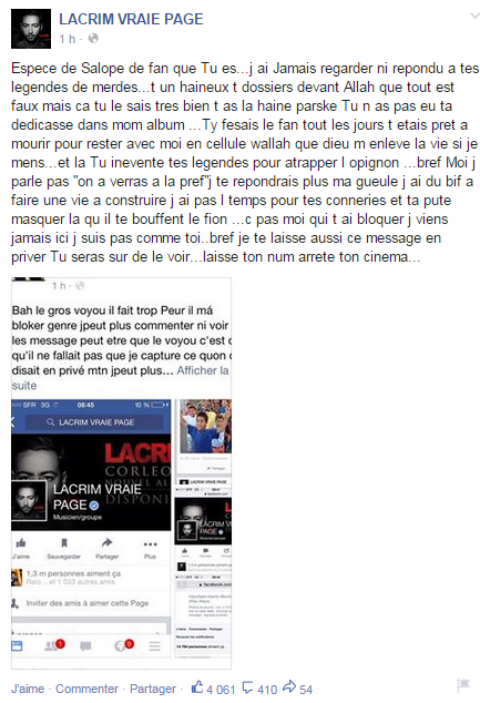 «Espece de Salope de fan que Tu es…j ai Jamais regarder ni repondu a tes legendes de merdes…t un haineux t dossiers devant Allah que tout est faux mais ca tu le sais tres bien t as la haine parske Tu n as pas eu ta dedicasse dans mom album …Ty fesais le fan tout les jours t etais pret a mourir pour rester avec moi en cellule wallah que dieu m enleve la vie si je mens…et la Tu inevente tes legendes pour atrapper l opignon …bref Moi j parle pas « on a verras a la pref »j te repondrais plus ma gueule j ai du bif a faire une vie a construire j ai pas l temps pour tes conneries et ta pute masquer la qu il te bouffent le fion …c pas moi qui t ai bloquer j viens jamais ici j suis pas comme toi..bref je te laisse aussi ce message en priver Tu seras sur de le voir…laisse ton num arrete ton cinema…»