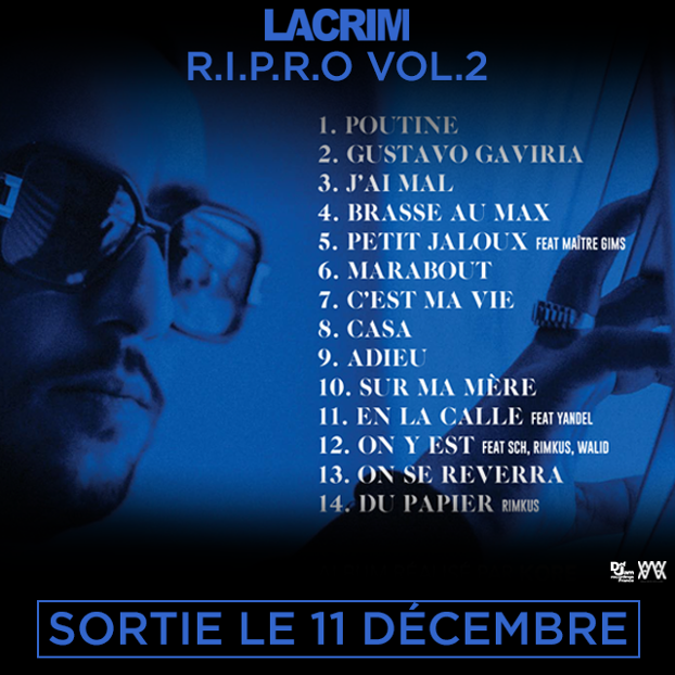 Après huit mois de cavale, Lacrim s’est rendu à la justice lundi 9 novembre au commissariat de L’Haÿ-les-Roses, dans le Val-de-Marne, pour purger sa peine (ndlr : condamné en mars à trois ans de prison ferme). Aujourd’hui, l’arabe avec de l’attitude nous dévoile le tracklisting de sa nouvelle mixtape RIPRO VOLUME 2. Un projet composé de 14 titres où l’on retrouve Maitre Gims, SCH, Walid, Rimkus et Yandel. Pour la promotion de ce nouvel opus, Lacrim s’est appuyé sur deux clips « Gustavo Gaviria » qui a dépassé les 7 millions de vue en un mois et « Poutine » qui avoisine les 5 millions de vues en deux semaines. L’artiste qui ne pourra pas défendre sa mixtape peut déjà compter sur son public impatient de découvrir son projet. Vous pouvez dès à présent pré-commander son CD qui sera disponible le 11 décembre prochain :
