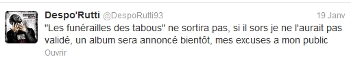 Despo Rutti annonce via son Twitter que son deuxième album « Les funérailles des tabous « ne devrait jamais voir le jour. Aucune explication n’est avancée par l’artiste qui se contente de préciser que si le projet sort cela sera sans sa validation et qu’un autre album pourrait être annoncé.