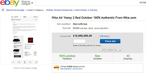 Les heureux élus de cette paire de basket on vite compris qu’ils pourrait en récupérer un bénéfice assez conséquent, on pouvait alors voir des sommes mirobolantes proposés par les acquéreurs de la Nike Air Yeezy, les prix proposés s’étendait de 10 000 Dollars à 10 millions de Livres Sterlings.