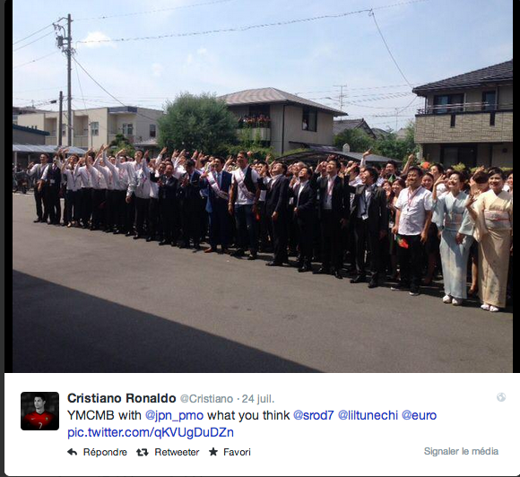 Visiblement enthousiaste de cette nouvelle, Cristiano Ronaldo a posté hier un cliché sur Twitter où on le voit avec le Premier ministre du Japon et des officiels du pays. Tous les protagonistes, effectuaient sourire aux lèvres, le signe YMCMB du label de Lil Wayne.