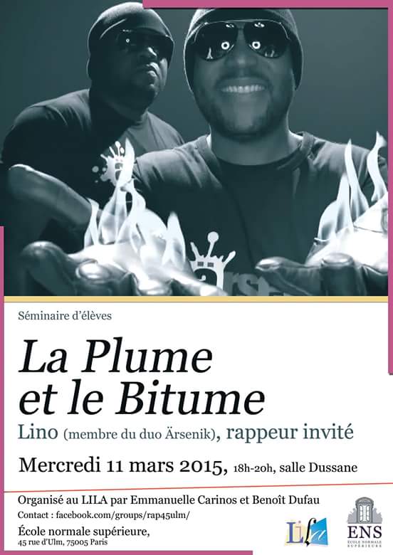 Mercredi 11 Mars, à partir de 18 heures Lino sera présent à l’Ecole Normale Supérieure. Le rappeur a été invité par l’une des meilleures écoles françaises dans le cadre d’un séminaire intitulé «La Plume et le Bitume». L’idée est de comprendre comment les artistes de rap conçoivent leurs textes. Qui de mieux, que l’une des meilleurs plumes du rap français selon bon nombre d’observateurs pouvait répondre à cette question? Ainsi, Lino expliquera devant l’assistance de l’école son point de vue sur le sujet. Son album à succès REQUIEM, sorti en janvier dernier servira de support parfait à cette problématique grâce à ses nombreuses figures de styles et punchlines. L’entrée est libre et chacun peut assister à ce séminaire organisé par Benoît Dufau et Emmanuelle Carinos dans une salle de 200 places. Le séminaire aura lieu de 18h à 20h.
