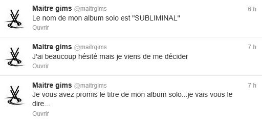 Le suspense autour du nom du premier album solo de Maître Gims a pris fin. Le membre de la Sexion d’Assaut a choisi de l’annoncer hier sur Twitter. Il s’appellera « Subliminal ».