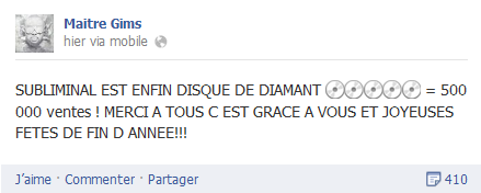 « Subliminal est enfin Disque de Diamant = 500 000 ventes ! Merci à tous c’est grâce à vous et Joyeuses fêtes de fin d’année »