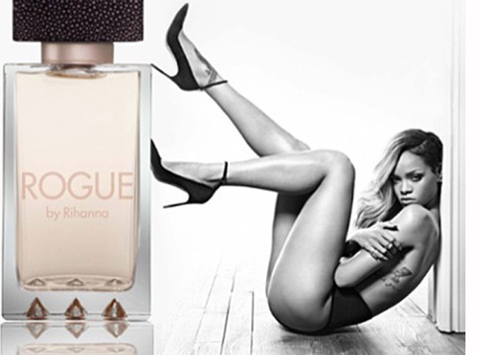 Pour la promotion de son parfum Rogue, Riri prend une position très sexy, à moitié nue et en talons aiguilles sur l’affiche.