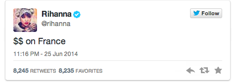 Hier, la chanteuse à suivi le match Equateur-France. Il semblerait qu’elle soutenait la France puisqu’elle a tweeté : « $$ on France ».