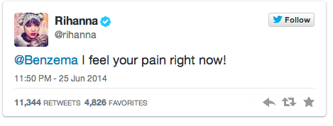 Rihanna a ensuite interpellé Karim Benzema dans un autre tweet : « @Benzema, je ressens ta douleur ».