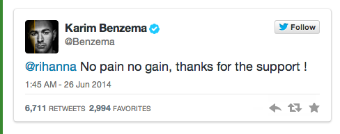 Benzema lui a répondu quelques heures plus tard : « @Rihanna Pas de victoire sans peine, merci pour le soutient »