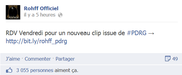 Rohff continue de faire vivre son album, en effet, l’artiste du 94 a donc décidé de balancer un nouveau clip de son album P.D.R.G. Hier en fin de soirée, Roh2f a publié un statut sur son Facebook officiel annonçant l’arrivée de cette nouvelle vidéo :