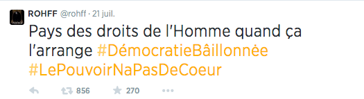 Rohff, très sensible à la cause palestinienne et après avoir effectué un don apparemment très généreux à l’association Islamic Freedom, s’est attaqué hier au Président de la République sur Twitter en déclarant : « Pays des droits de l’Homme quand ça l’arrange #DémocratieBâillonnée #LePouvoirNaPasDeCoeur ».