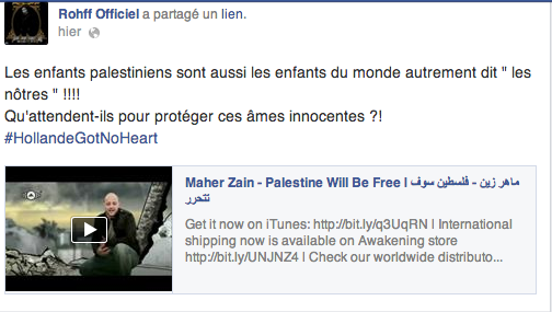 Un peu plus tard sur Facebook, Roh2f a posté un autre message en soutien à la Palestine tout en blâmant François Hollande : « Les enfants palestiniens sont aussi les enfants du monde autrement dit » les nôtres » !!!! Qu’attendent-ils pour protéger ces âmes innocentes ?! #HollandeGotNoHeart ».