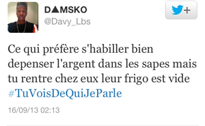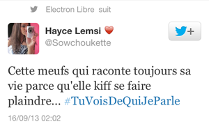 « Tu vois le genre de filles toujours accompagnées de dealer/rappeur/footeux qui vident les bouteilles dans les clubs et font qui des allers retours pour faire pipi et se repoudrer le nez , tu vois de qui je parle ? »