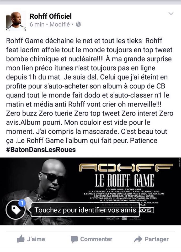 Dans un texte publié sur sa page Facebook – et depuis supprimé – Housni M’Kouboi de son vrai nom s’excuse auprès de ses fans pour ce désagrément mais donne l’impression qu’un complot destiné à lui nuire est mis en place, « #BatonDansLesRoues » écrit-il en hastag. De plus, il place une pique à son rival Booba dont la précommande sur Itunes de son album NERO NEMESIS était bien disponible à l’heure logique. « Celui que j’ai éteint en profite pour s’auto-acheter son album à coup de CB quand tout le monde fait dodo et s’auto-classer n1 le matin et média anti Rohff vont crier oh merveille!!! » ironise Rohff. Remonté, il conclut son message « J’ai compris la mascarade. C’est beau tout ça ».