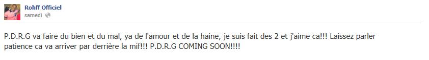« P.D.R.G va faire du bien et du mal, de l’amour et de la haine, je suis fait des 2 et j’aime ca !!! Laissez parler patience ca va arriver par derrière la mif !!! P.D.R.G COMING SOON !!!! »