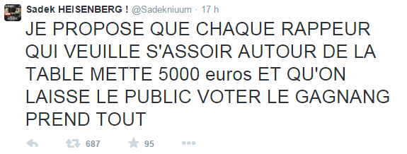 «JE PROPOSE QUE CHAQUE RAPPEUR QUI VEUILLE S’ASSEOIR AUTOUR DE LA TABLE METTE 5000 euros ET QU’ON LAISSE LE PUBLIC VOTER LE GAGNANT PREND TOUT»