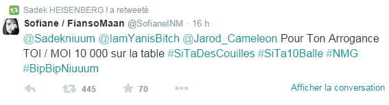 « @Sadekniuum @IamYanisBitch @Jarod_Cameleon Pour Ton Arrogance TOI / MOI 10 000 sur la table #SiTaDesCouilles #SiTa10Balle #NMG«