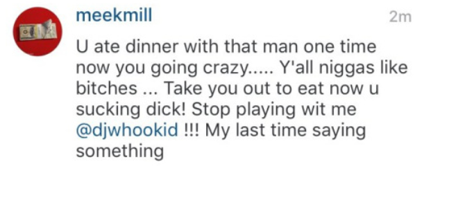 Un post qui n’est pas passé inaperçu et qui a fait sortir Meek Mill de ses gonds. Le membre du label MMG s’est empressé de répondre au DJ via son compte Instagram. Il a donc insulté Whoo Kid de « pu** » et de « suceur » puis l’a sommé de ne « pas jouer avec lui ».