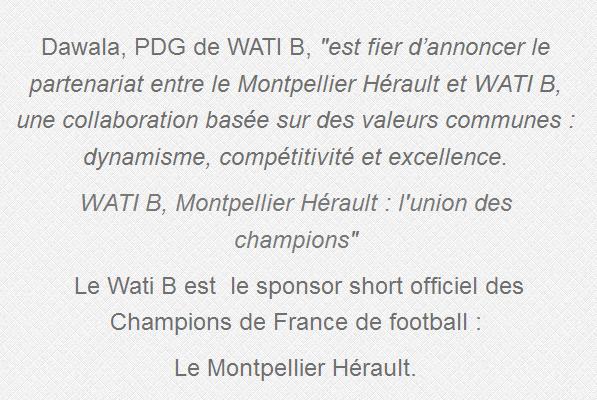 Après le partenariat de la Sexion d’Assaut avec le jeu Pro Evolution Soccer, c’est maintenant à la marque Wati B de faire son entrée dans le monde du football. En effet, Wati B va sponsoriser le Montpellier Hérault Sport Club, champion de France en titre. L’annonce a été faite sur le site officiel de la marque: